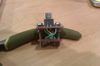 「USBマイクロBコネクタ・ピッチ変換基板」です。メスのほうは穴のところを削ってます。